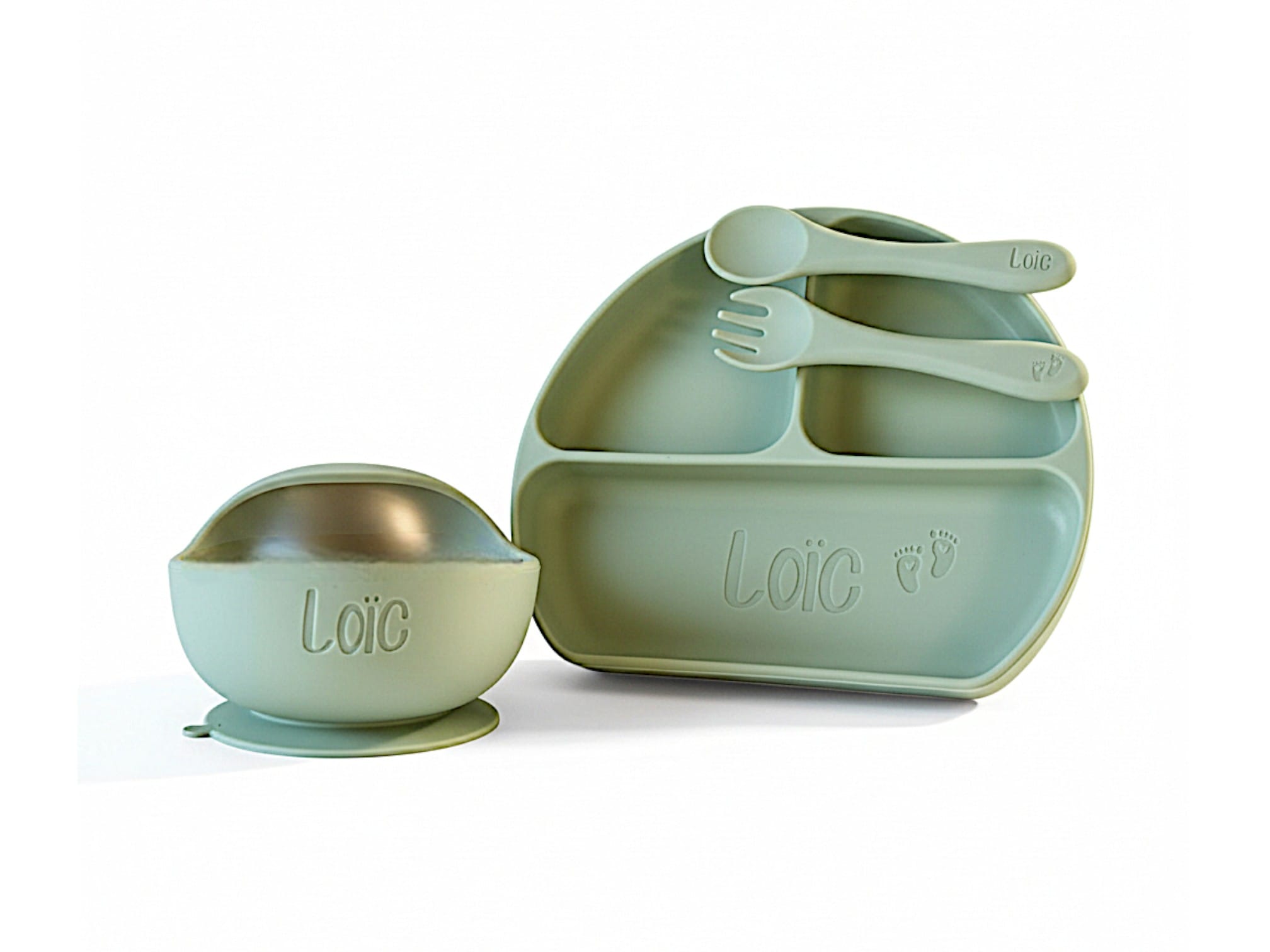 An incredibly beautiful and personalized birth gift! This gift set includes a children’s plate, bowl, fork and spoon. You can provide the fork, spoon and plate with the child’s name or text and possibly a desired symbol! A unique and very practical gift. A beautiful silicone bowl in which to serve delicious fruit and vegetable snacks. The Cutlery is specially designed for babies, so it can be used from the very first bite! *Note: currently our cutlery sets are made entirely of silicone material and therefore completely dishwasher safe, so this differs from the photo. We are working hard to adjust this as soon as possible.