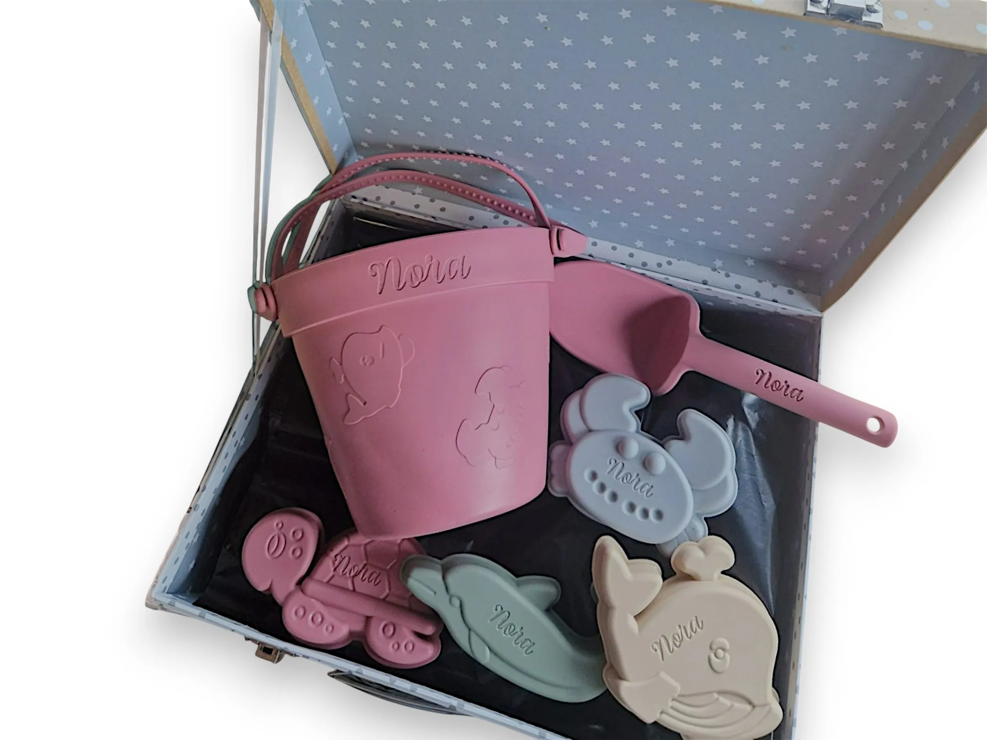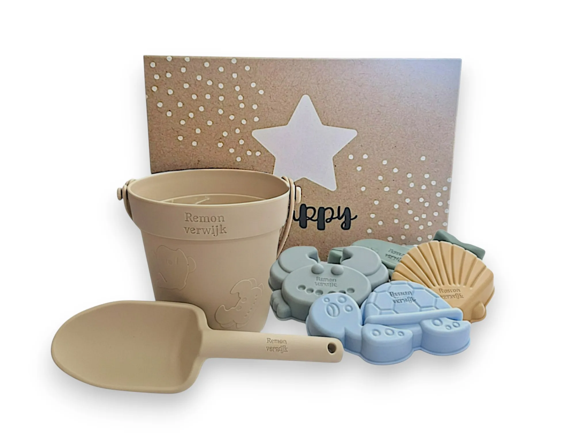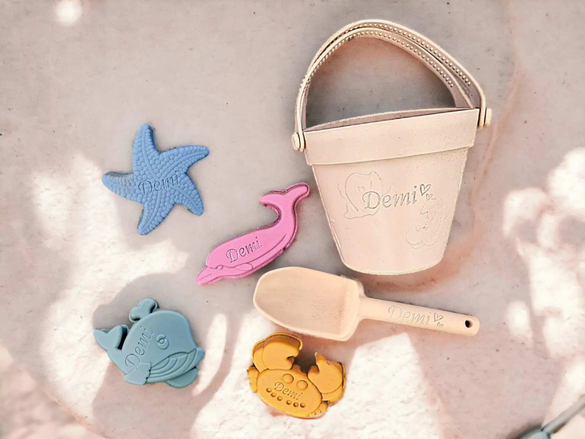 We provide the bucket with name or text for free so everyone knows it’s your set! You have a variety of fonts to choose from in this and you can add a fun symbol if you like! Prefer to name the whole set? You can! You can click this option (at an additional cost) when ordering. This way, of course, you are even less likely to lose all these pretty goodies.