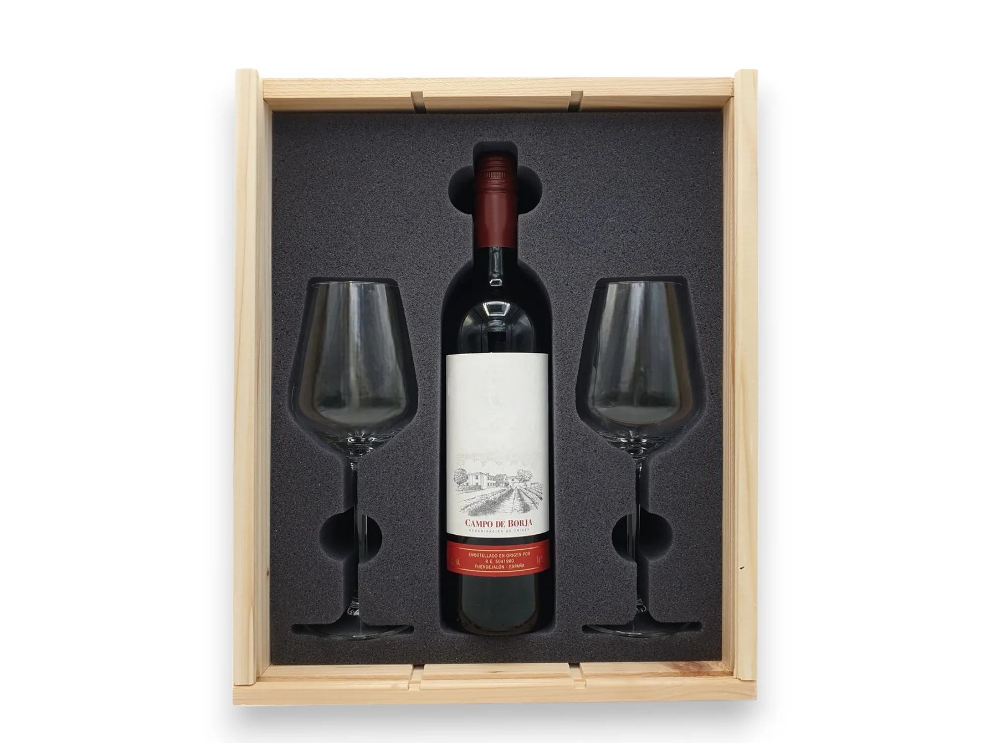 Zéér populair in onze webshop is deze 3-luik wijnkist met luxe wijnglazen. De kist bevat een schuifdeksel, welke te voorzien is van een geheel eigen ontwerp!