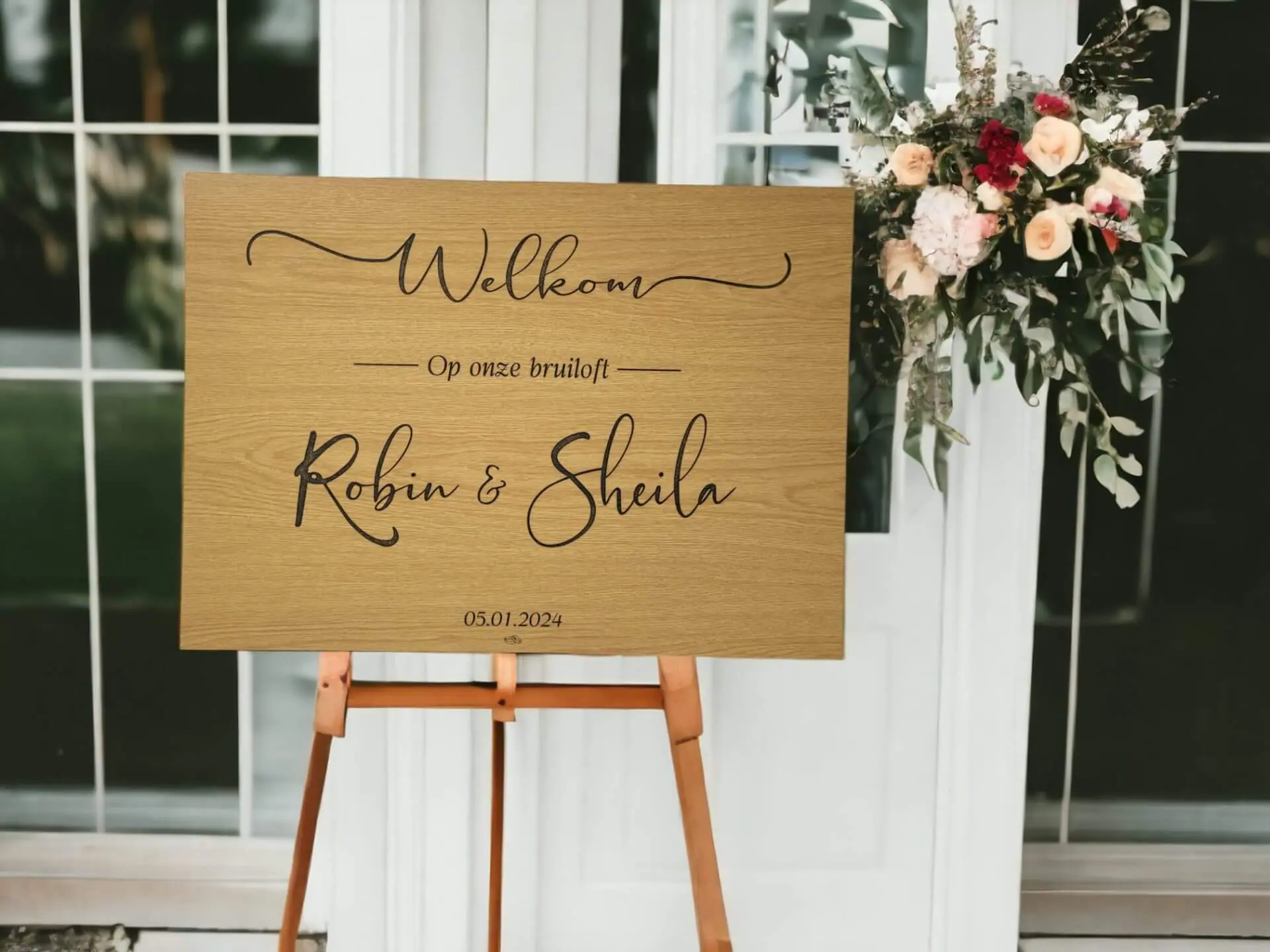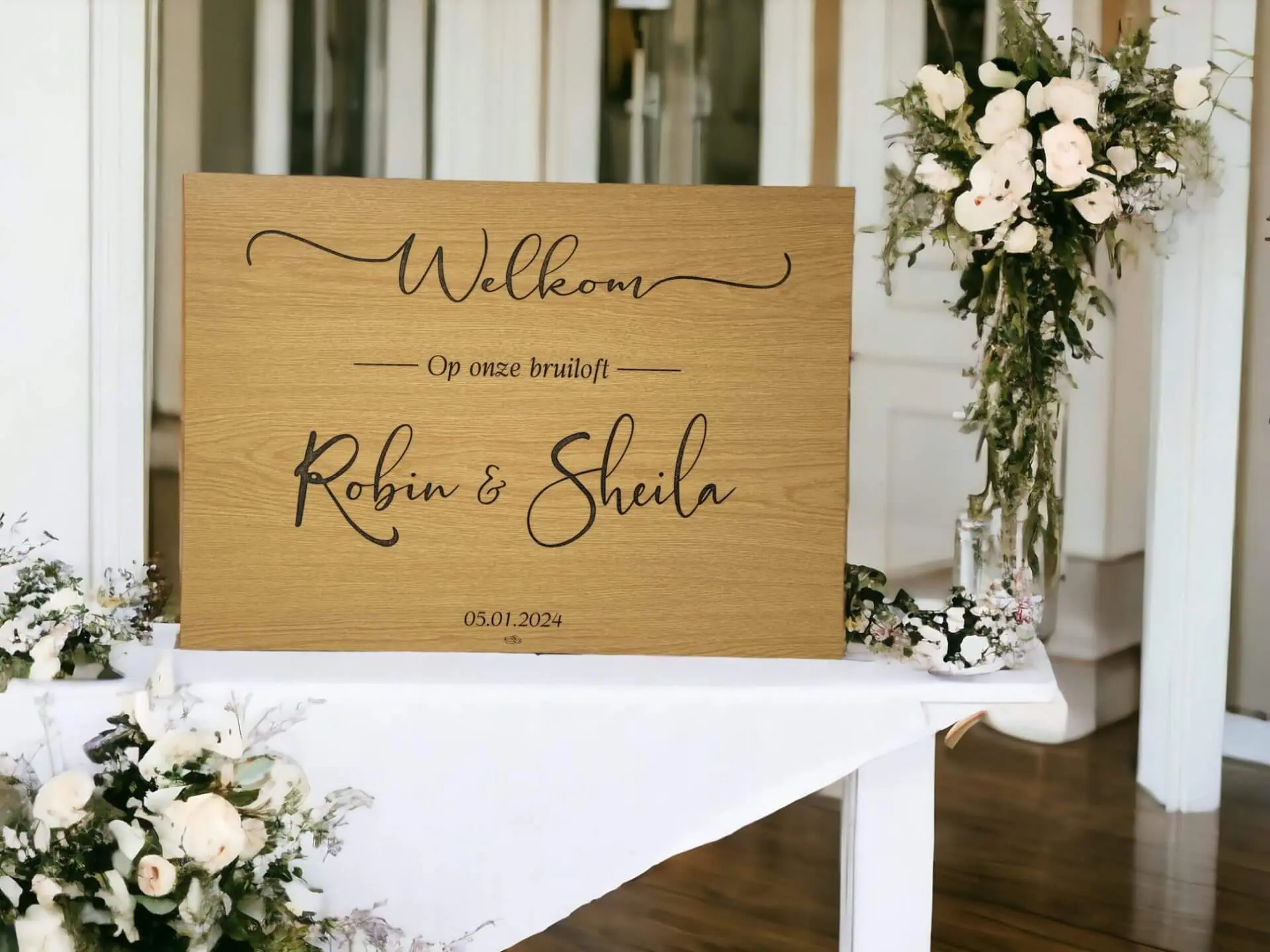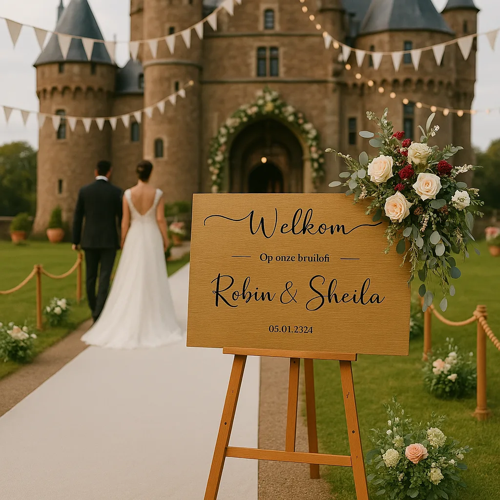 Een gepersonaliseerd welkomstbord is een mooie manier om alle gasten te begroeten en ze welkom te heten op een persoonlijke manier. Zo geef je ze direct het gevoel dat ze deel uitmaken van deze bijzondere dag.