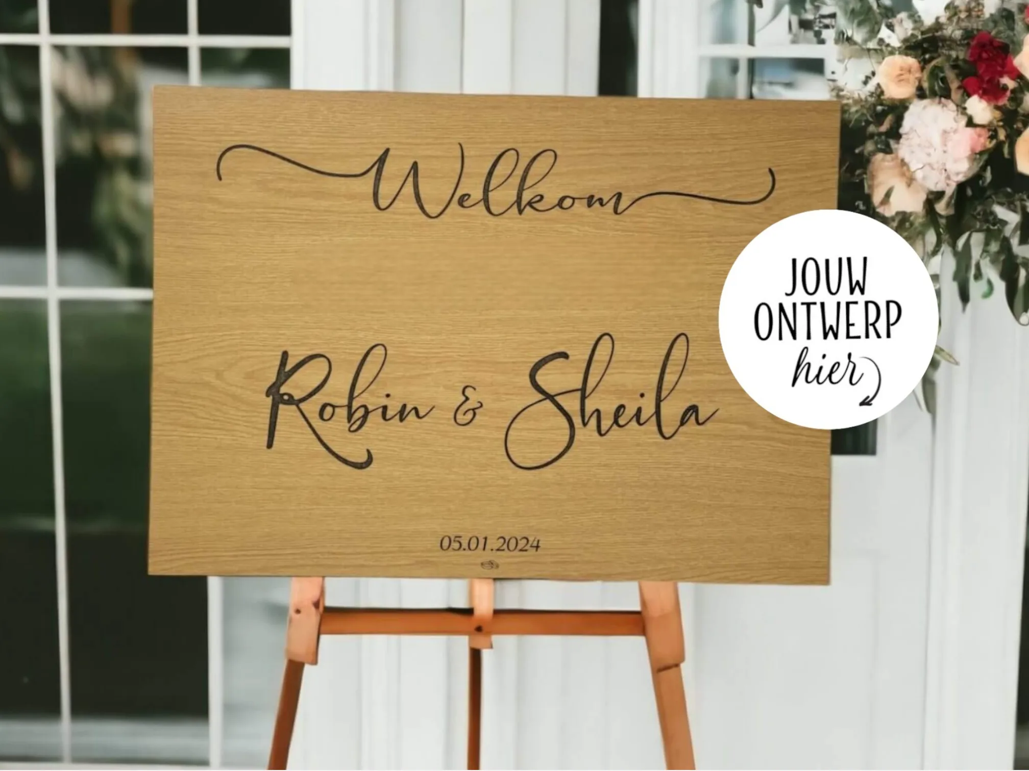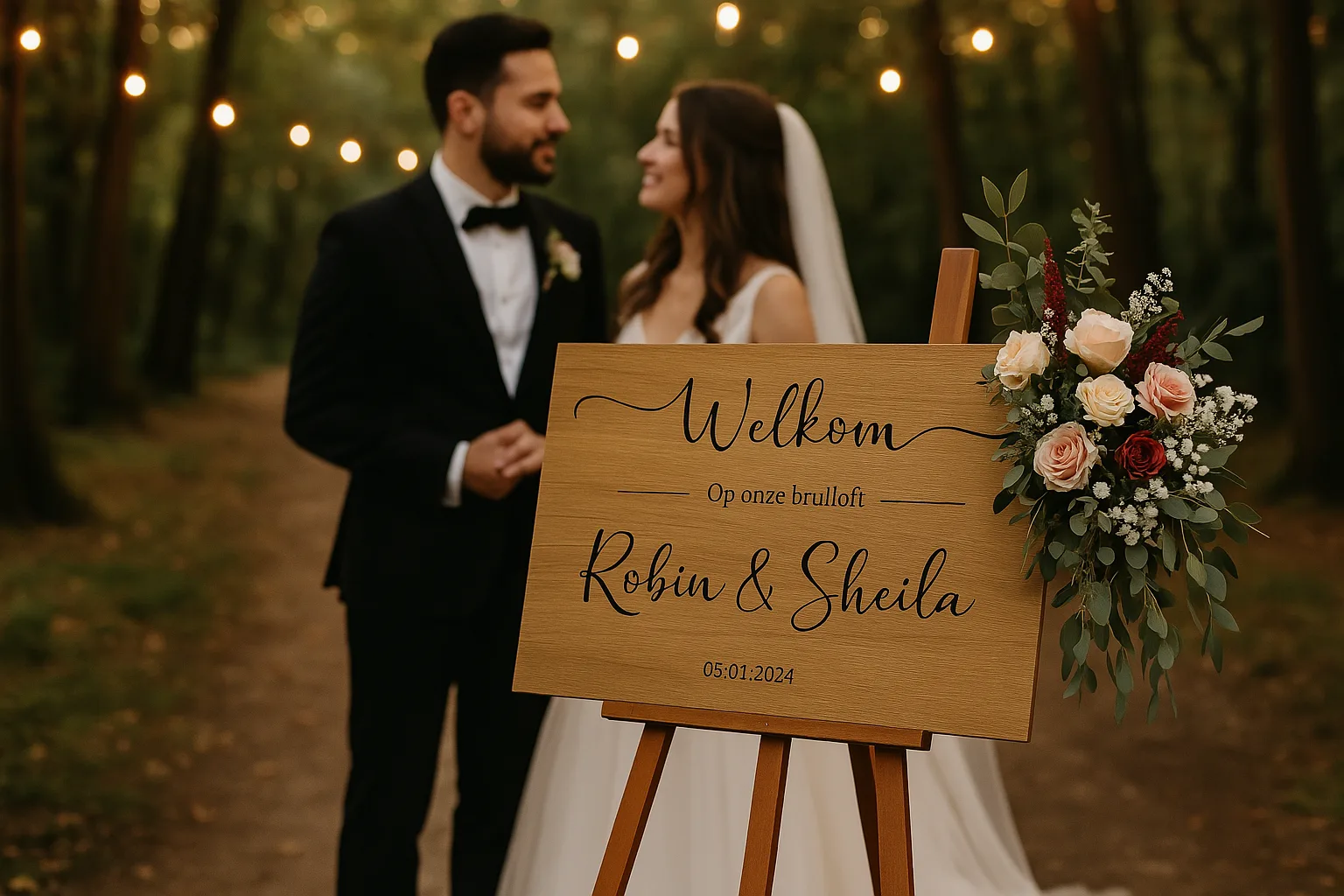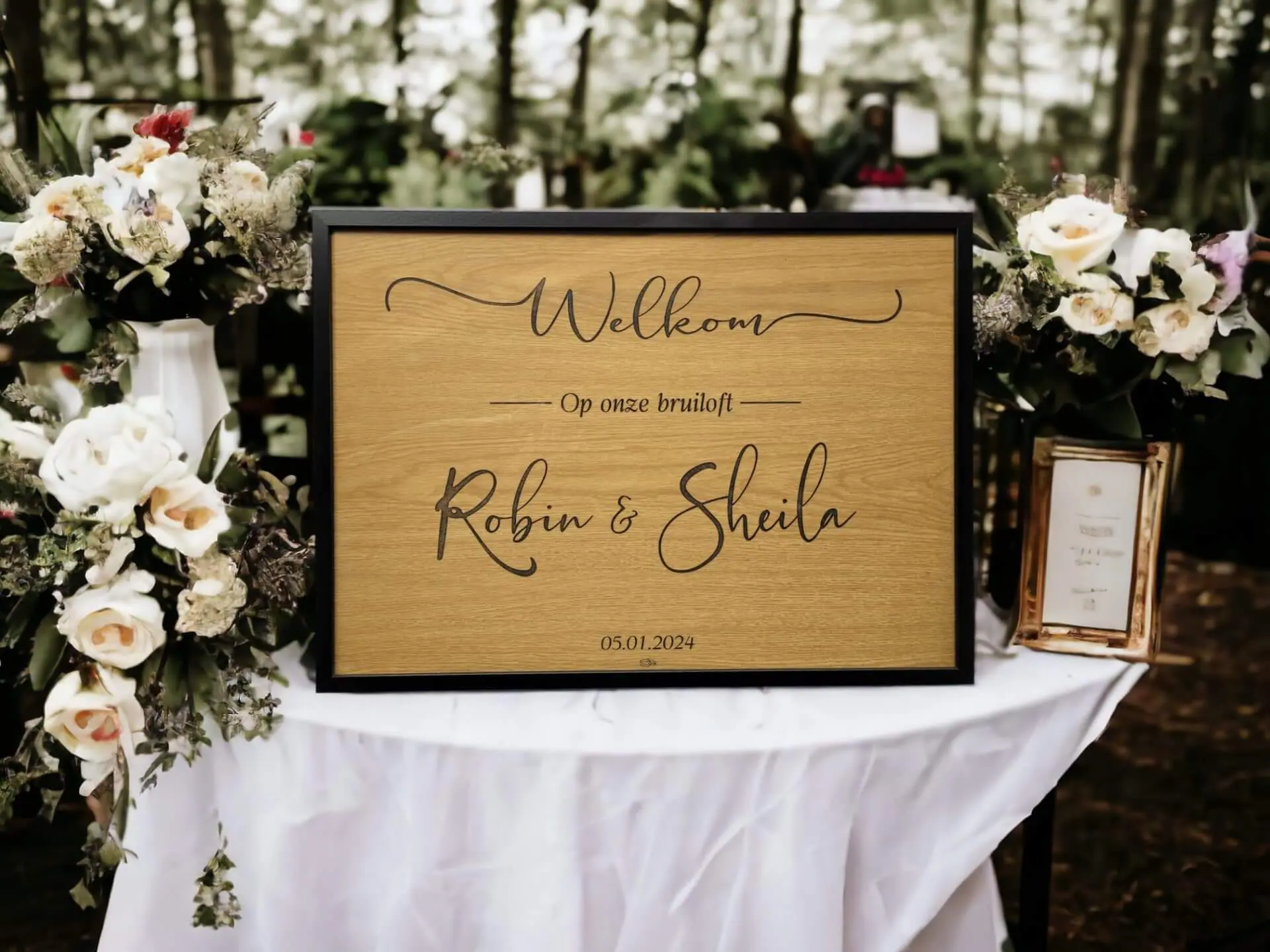Een gepersonaliseerd welkomstbord is een mooie manier om alle gasten te begroeten en ze welkom te heten op een persoonlijke manier. Zo geef je ze direct het gevoel dat ze deel uitmaken van deze bijzondere dag.