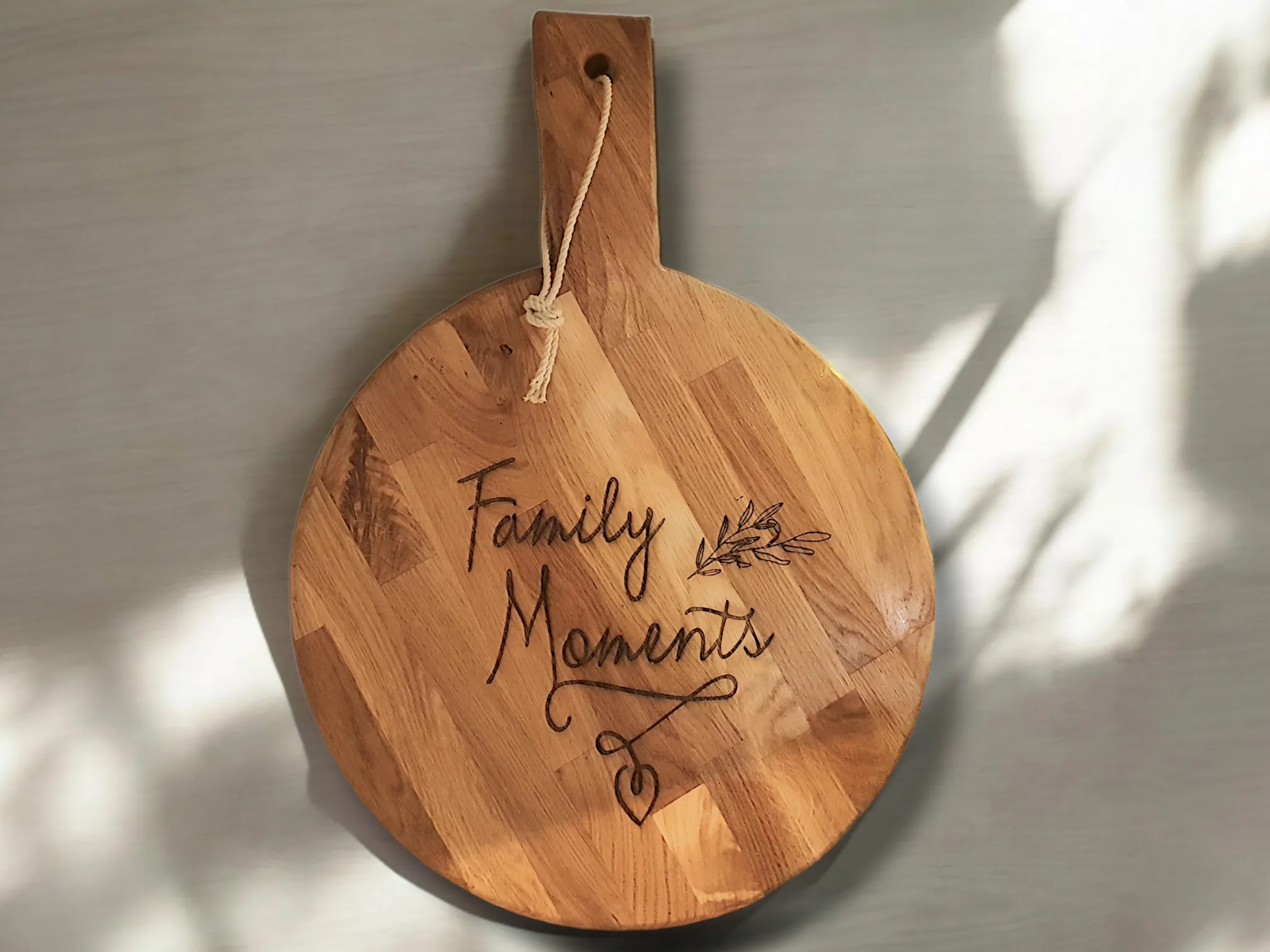 Op zoek naar een origineel en stijlvol cadeau voor een housewarming, trouwerij of de feestdagen? Deze luxe eiken borrelplank XL met de tekst Family Moments is een absolute blikvanger en wordt gegarandeerd met veel plezier ontvangen. Het laat je stil staan bij alle mooie momenten die je als familie samen beleefd. Iedere dag weer! Ook in je eigen keuken staat hij prachtig als decoratie of om samen van te genieten tijdens een gezellige borrel.
