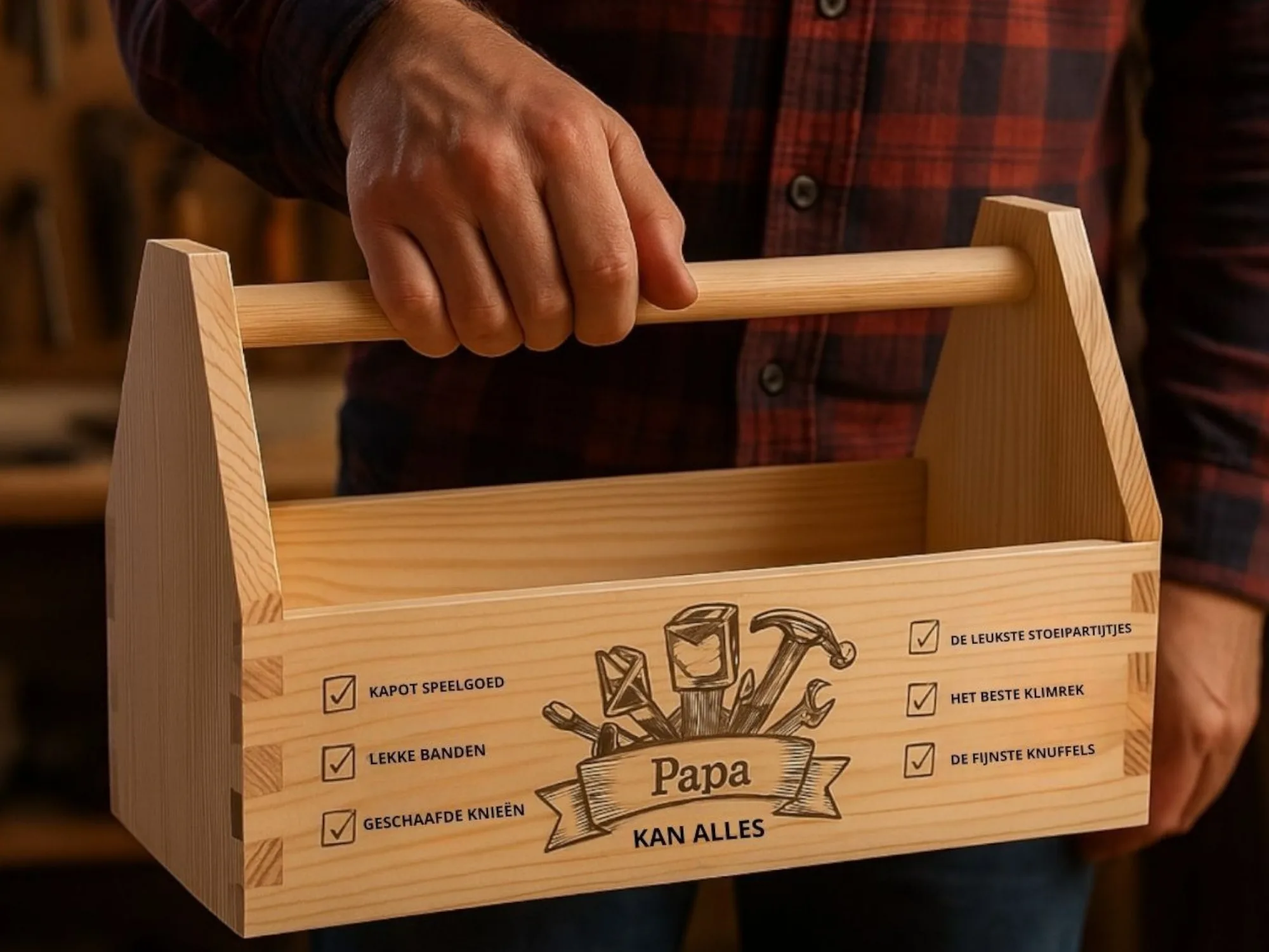 Til je klusmoment naar een hoger niveau met ons unieke houten gereedschapskistje! Je kunt het kratje in een handomdraai volledig naar jouw smaak personaliseren met onze handige ontwerptool! Dit gereedschapskist is perfect om cadeau te doen voor Vaderdag, iemand die net een nieuwe woning heeft, met pensioen gaat of maak eens iets leuks voor jezelf! Voor decoratief gebruik (i.v.m. de dunne bodem)