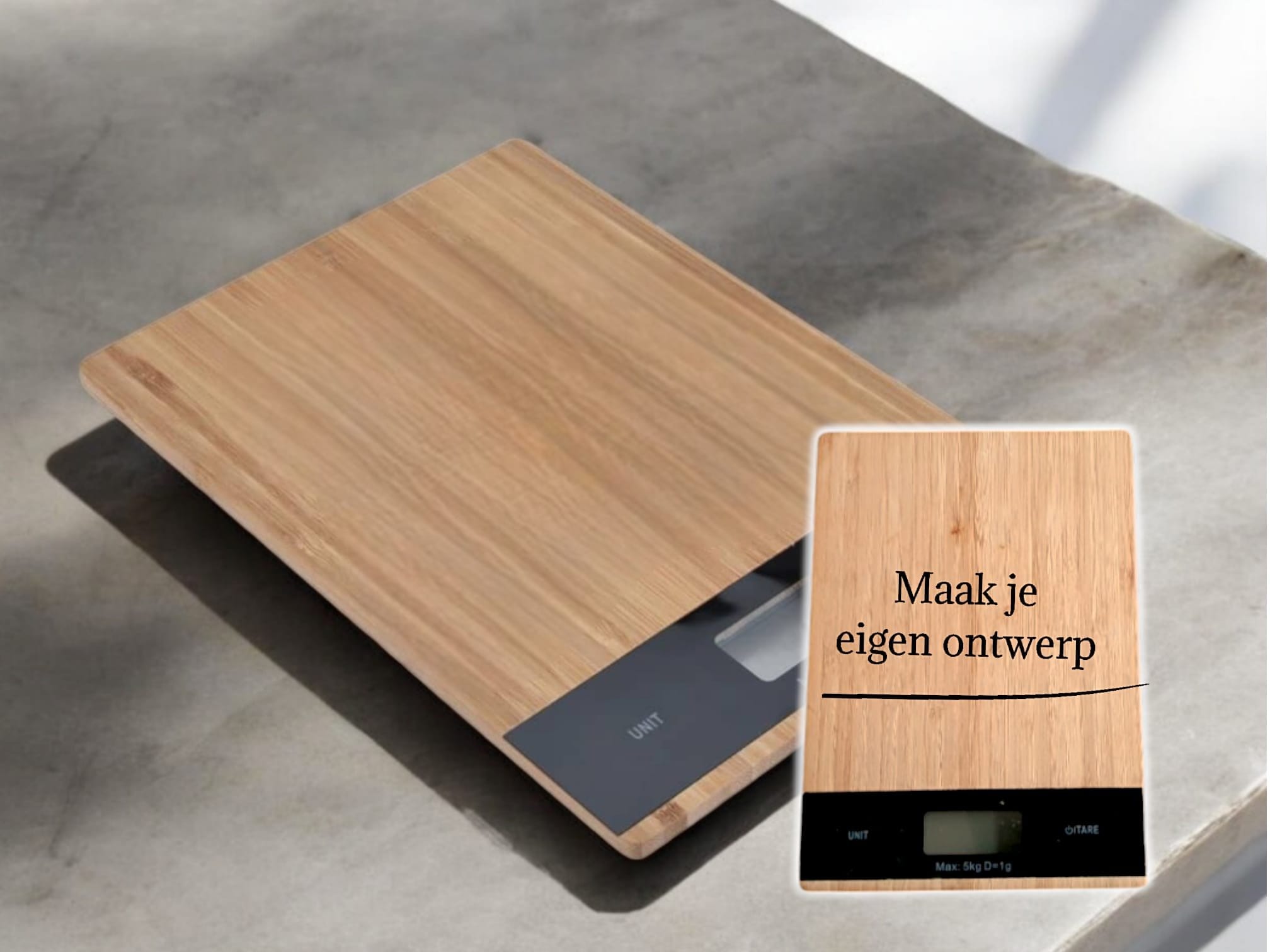 Erg leuk item in onze webshop, deze keukenweegschaal van bamboe hout. Dit product is te voorzien van uw geheel eigen ontwerp naar keuze!