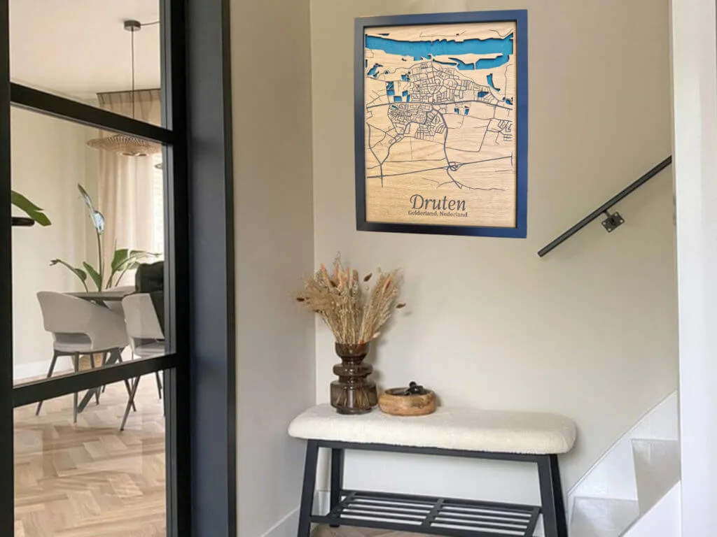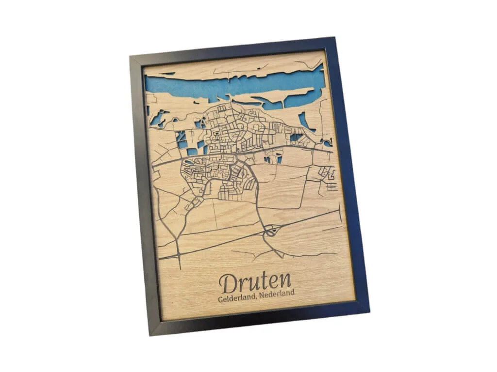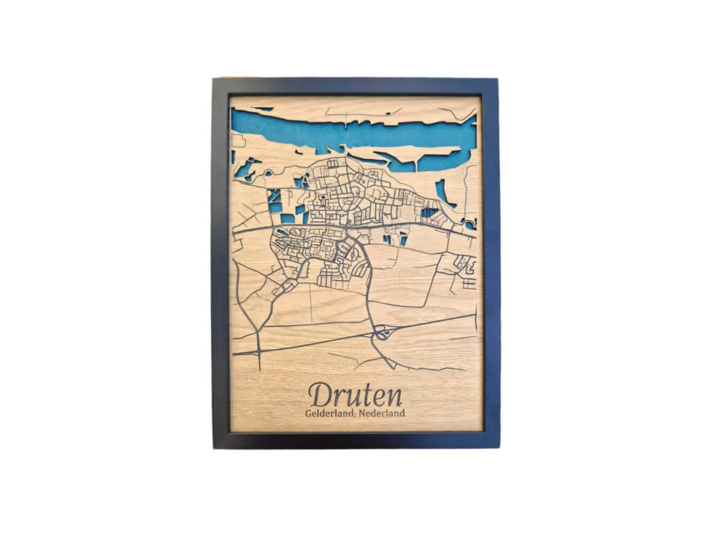 Nieuw in ons assortiment! Onze unieke ingelijste plattegrond van Druten. Dit kunstwerk is gemaakt van 3mm Eiken lamineer. Het water ligt verdiept en is blauw van kleur, wat een mooi effect geeft! Het aanwijspunt is gemaakt van 3mm mdf (wit) en zijn makkelijk op te hangen met het ophangsysteem! Super leuk om deze cadeau te geven of jezelf te verwennen op iets moois! Een echte eyecatcher voor in de woonkamer, keuken, kantoor of Mancave