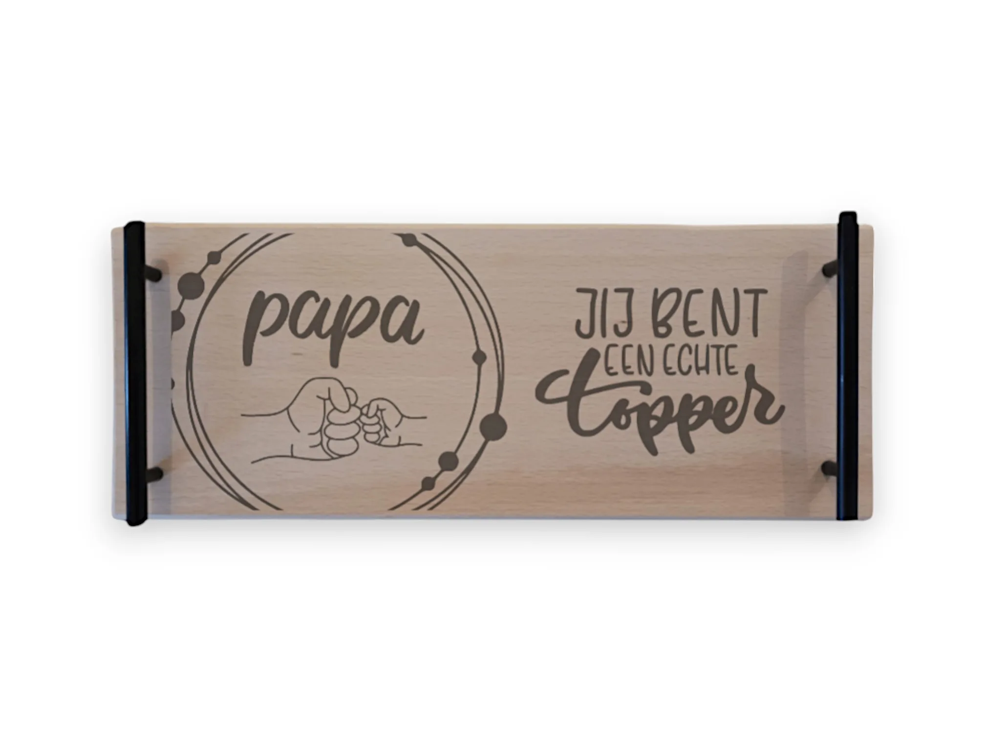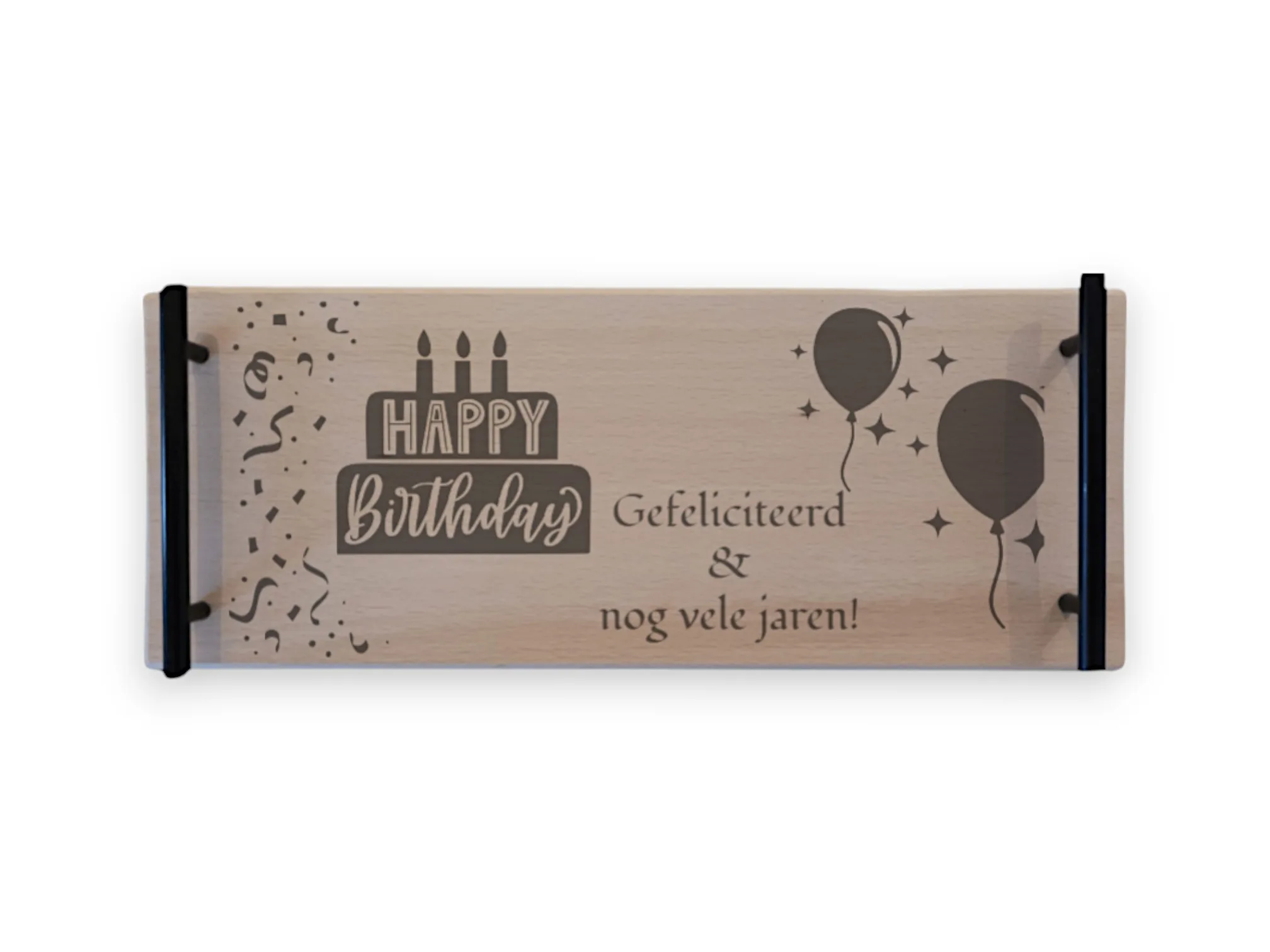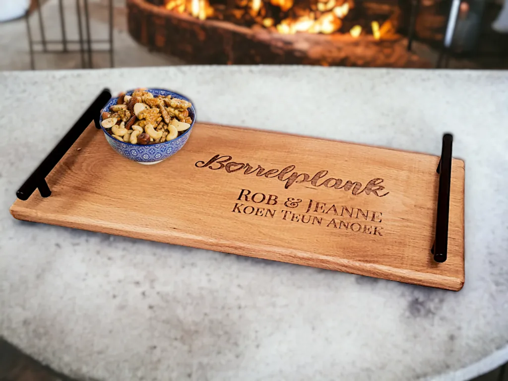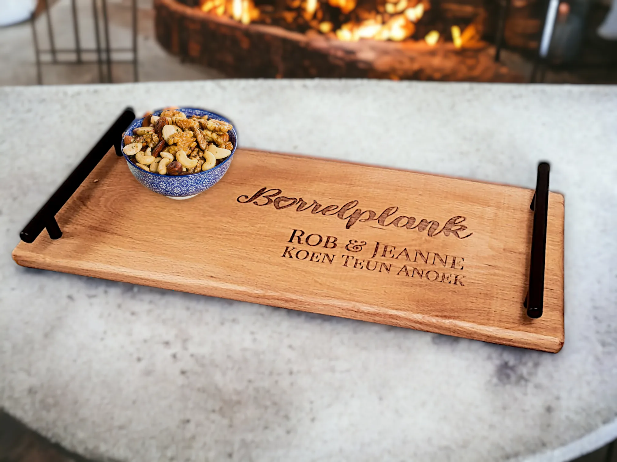 Deze handgemaakte beukenhouten borrelplank met stevige, zwarte stalen handvaten is ideaal voor wie zoekt naar een bijzonder, gepersonaliseerd cadeau. Perfect voor een housewarming, bruiloft of als origineel geschenk voor een collega! Met een royaal formaat van 50×20 cm biedt deze plank meer dan genoeg ruimte voor heerlijke hapjes. Een unieke kwalitatief goede plank die wordt gemaakt in onze eigen zagerij.